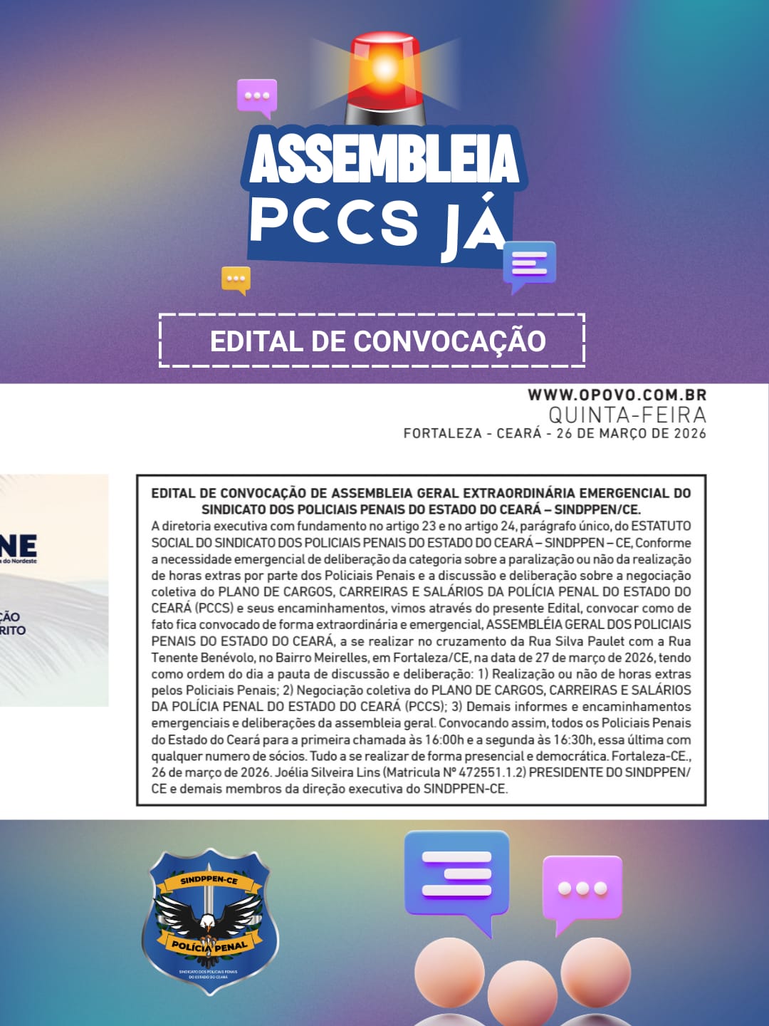 A Diretoria Executiva do Sindicato dos Policiais Penais do Estado do Ceará – SINDPPEN-CE, com fundamento no artigo 23 e no artigo 24, parágrafo único, do […]