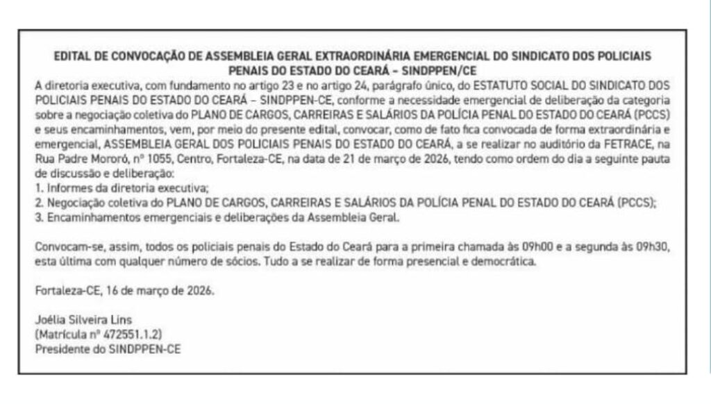 A Diretoria Executiva do Sindicato dos Policiais Penais do Estado do Ceará – SINDPPEN-CE, com fundamento no artigo 23 e no artigo 24, parágrafo único, do […]