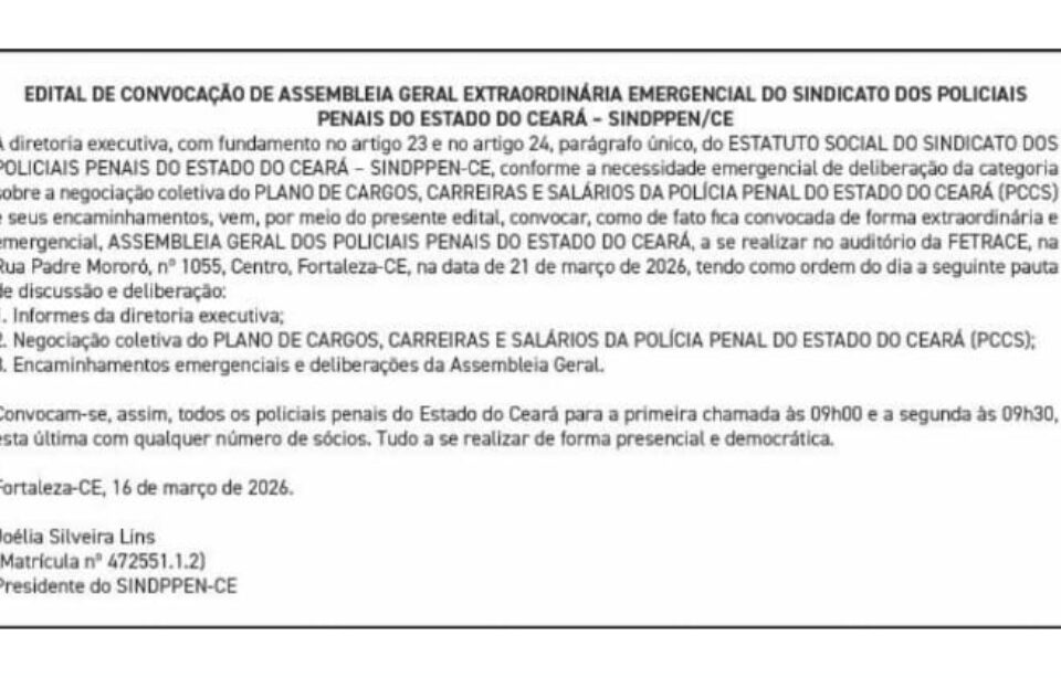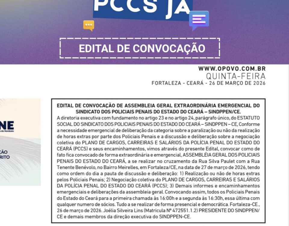 NOTA DE PESAR 🖤 Faleceu na manhã dessa quinta (18) o Policial Penal, José Adalberto Gomes Filho. O Sindppen-Ce reconhece o profissional honrado que Adalberto foi […]